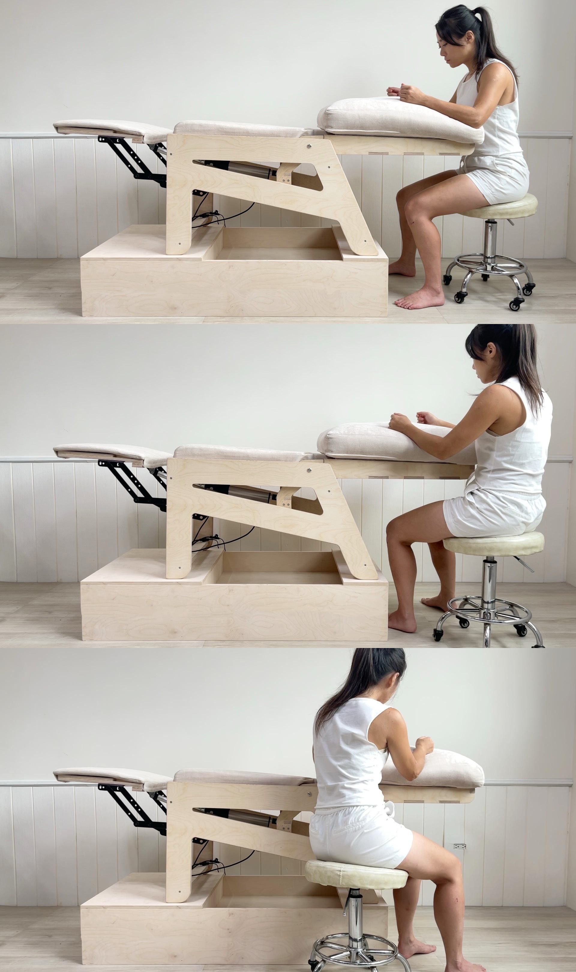 增高木箱的好處以下是兩種增高木箱高度的比較,建議依據施作座椅高低,與施作項目選擇對應高度。 使用12cm增高木箱 大部分營業用戶會使用增高墊,舒緩長時間彎腰的施作姿勢,改善駝背造成的工作不適,友善脊椎維持在中立坐姿,與增加沙發下背高度,使膝蓋腿部可以靈活伸展。 使用24cm增高木箱加墊增高箱後,背部會更加舒適,不需要彎腰過多去接近施作區域,腿部將會有更寬敞空間,增高箱有12與24cm高兩種尺寸供選擇。 不使用增高木箱 使用12cm增高木箱 使用24cm增高木箱 不使用增高木箱 使用12cm增高木箱 使用24cm增高木箱